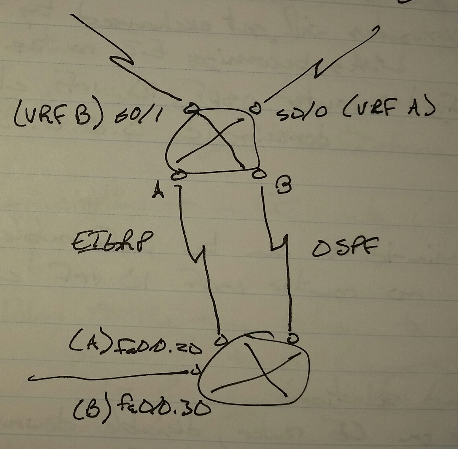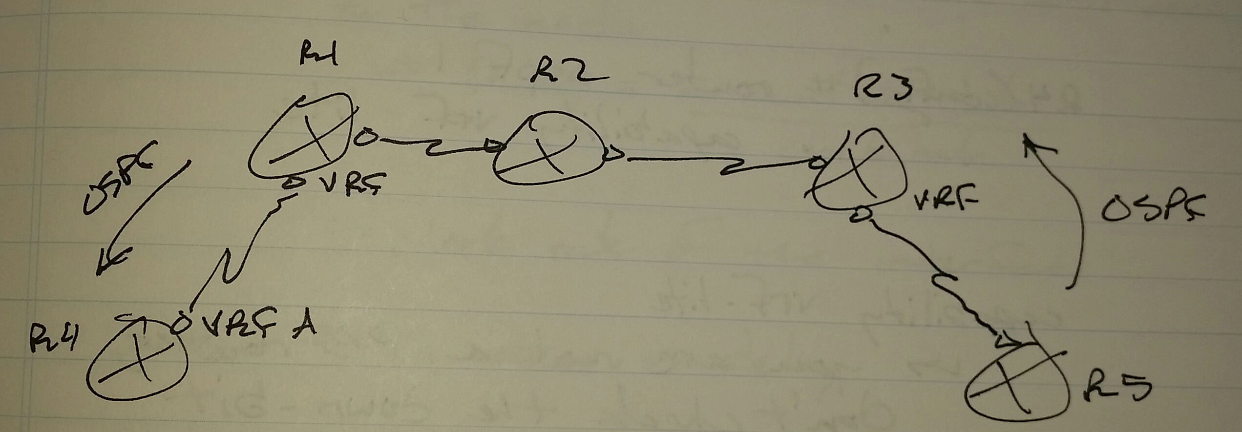 Scenario -> One branch of the customer is using VRF lite with OSPF as the PE – CE protocol. The other branch is not using VRF.